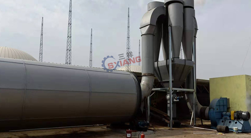 物料是在滚筒的转动下由流动的热风带动物料向后端运动,物料由系统采用的旋风分离器进行分离,收集率达99%以上。经旋风分离器捕集的细粉由旋风排料口排出进入后端利用。分离后的湿气进入终端除尘设备后排出。各工艺重要部位设有温度、电压、电流显示、记录、报警以及电器起动联锁程序。